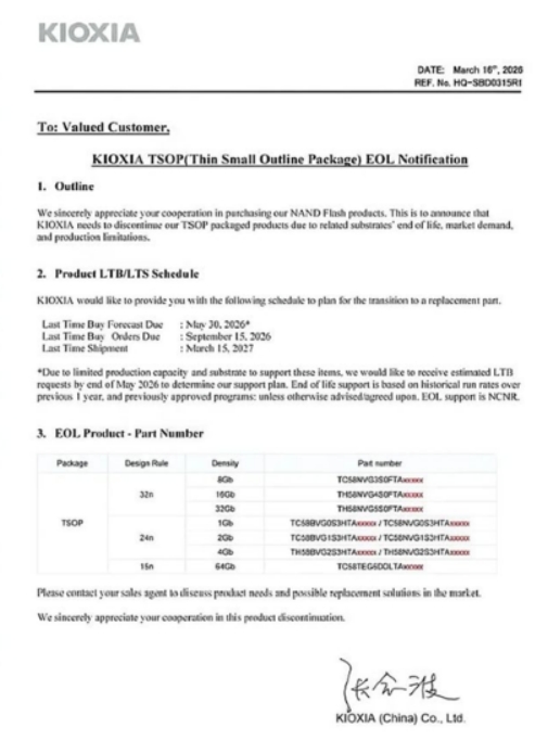 由于生產(chǎn)能力和基材限制,鎧俠表示,公司無法生產(chǎn)8Gb-64Gb的TSOP封裝產(chǎn)品。希望收到最后采購預(yù)測(即客戶最后一次下單數(shù)量)期限為2026年5月30日,以確定鎧俠的支持計(jì)劃。最后采購訂單截止日為2026年9月15日,最后出貨時(shí)間為2027年3月15日。